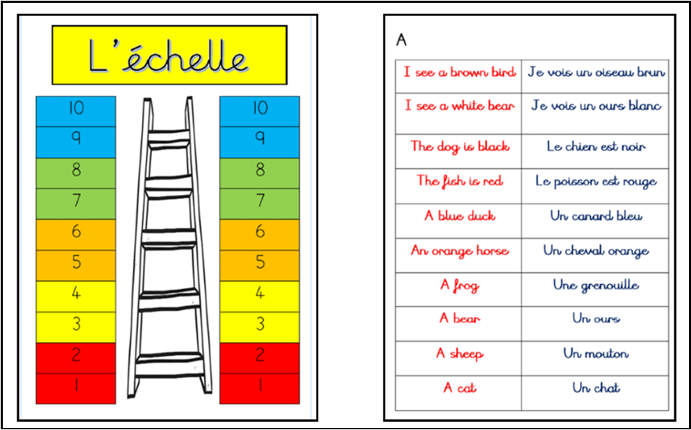 This idea was inspired by Miss Mey MFL, and simplified for primary language learners. Pupils work in pairs, placing a counter each at the bottom of the ladder. Pupil A then uses their sheet to read the first, and easiest, sentence aloud for Pupil B to translate. A can then check the translation carefully using the answer on their sheet. If B is correct, then they can move their counter up one rung of the ladder. Pupils then swap and it’s B’s turn to quiz A. For each correct answer, the player can move their counter one space up the ladder. If incorrect, they drop back down to the bottom. What works well here is that the activity is essentially self-differentiating, as children may reach a point at which the content is too complex and then drop back down to recap the language and structures at their level. Again, all pupils are engaged in the same activity.