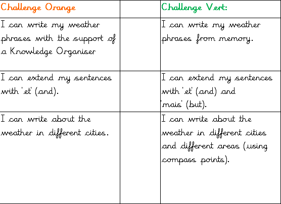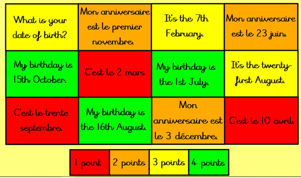 As I’ve already mentioned, I like to try and keep activities open-ended so that children can extend themselves as they feel confident. This is an example of a retrieval grid, the idea for which I got from Catriona Egan in a recent addition of Languages Today magazine. The aim of the activity is for children to translate as many boxes as they can within a given time period. The boxes are colour-coded depending on their difficulty and points awarded accordingly for correct translations. All children are enabled to produce something from the activity but the output will vary from pupil to pupil. Again, SEND pupils do not just have to stick to the simpler, red, translations but can push themselves to have a go at more complex phrases.
