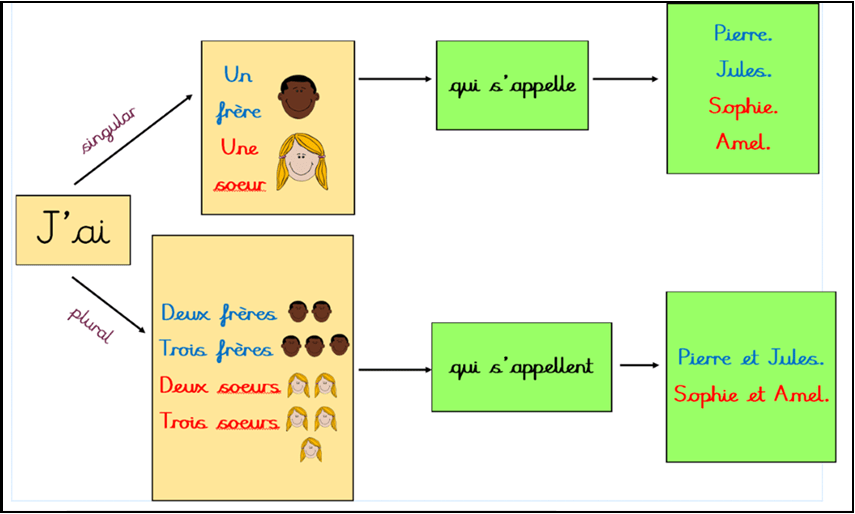 Here’s another example of a speaking/writing frame for Year 5 on family, following a slightly different model (this one was, again, inspired by suggestions made by Clare Seccombe at the ALL Primary Languages Conference back in October 2020). All pupils are accessing the content, which is the use of singular and plural, but they can choose how far they want to extend their sentences, from talking about the number of brothers and sisters they have, to moving on to names and even ages, which are not part of the frame and would be added independently.