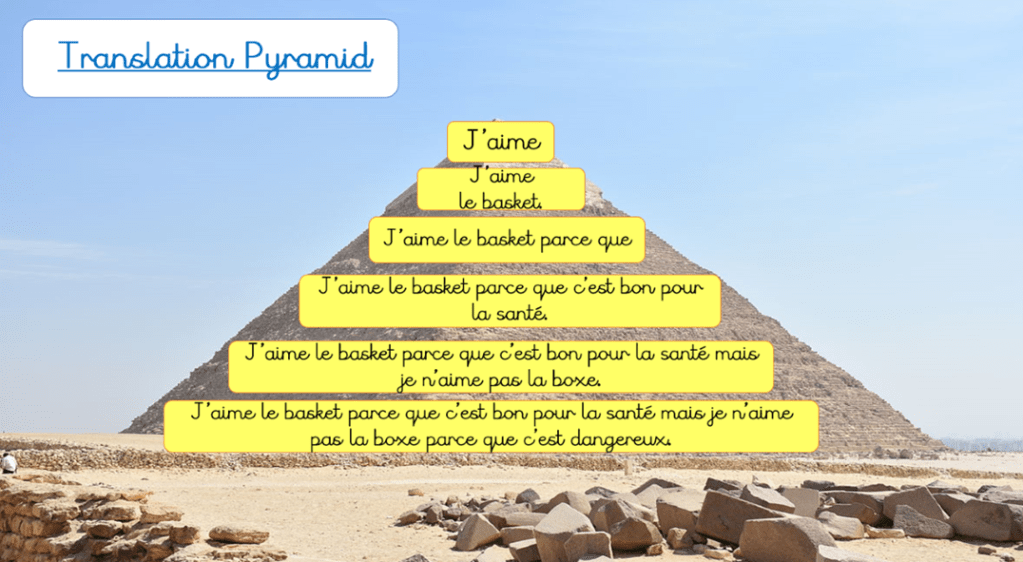 As you’ve probably realised by now, I prefer to have one resource which works for all learners and this Translation Pyramid activity, based on an original idea by Gianfranco Conti and for which credit must go to @simograv, is no exception. This can be adapted in various different ways but here we start at the top, translating the phrases as they advance in difficulty. This one is French to English but it could be the other way around. The final outcome will be different depending on ability level but all children will be engaged in the same activity.