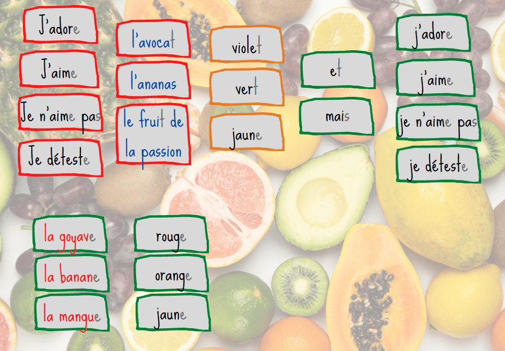 Word-order is another tricky area and children should be given opportunities to physically manipulate sentences where word orders are different from English, for example when considering adjective/noun order. Colour-coding word cards according to their function in the sentence (nouns, adjectives, verbs, etc.) helps pupils to recognise the role of an individual word within a sentence and being able to move them from one place to another allows for a low-stakes approach to sentence-building. Word cards give pupils more freedom than, say, a speaking or frame and this also means that they are more likely to make mistakes, which can then be identified and discussed, ultimately leading to deeper learning.