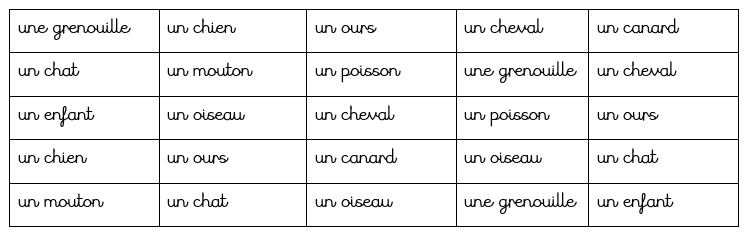 This wonderful activity was shared by the inspirational Angela Smith at a recent meeting of the Association for Language Learning Leicester Primary Hub and has proved to be a great success. It takes a tad more prep but generates some fantastic discussion. Pupils each have a grid with a range of vocabulary written within it. They must all choose a row, column or diagonal line and select the word which they consider to be the odd one out. There is really no “right” or “wrong” answer, as long as the pupil can justify their choice – an idea which children seem to find very empowering. Example answers for the grid below might include comments on the gender of the nouns (“Une grenouille is the odd one out because it’s the only one which is feminine.”), discussions around silent letters (“Un chat is the odd one out because it’s the only one which ends in a silent e.”) or even where the animal lives (“Un poisson is the odd one out because it’s the only one that lives in water.”) I find it very interesting to see what sorts of answers pupils come up with, some of which can be very original! Colour-coding of nouns according to gender, greying out of silent letters, as well as supporting images could also be added to the grid to support SEND/EAL learners.